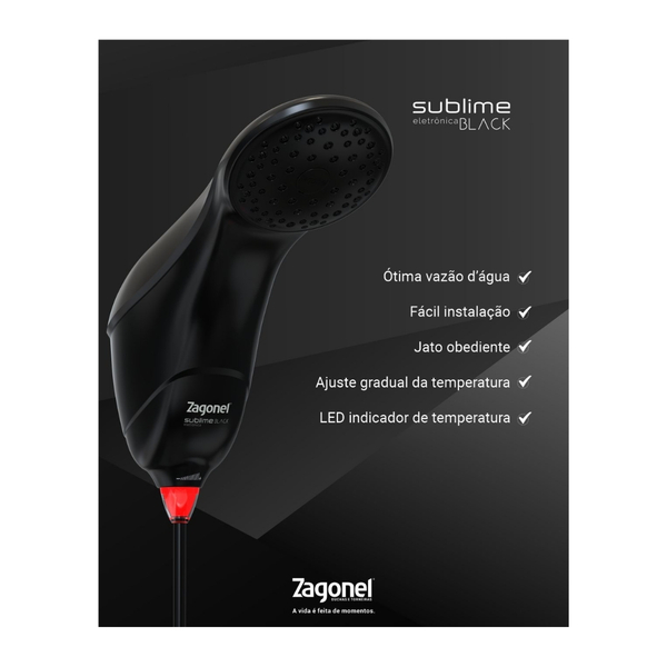 Chuveiro zagonel sublime eletrônico preto 127v – a inovação que você merece! a ducha eletrônica sublime foi desenvolvida para tornar cada banho um experiência com sofisticação, qualidade e segurança para toda a família. o sistema de regulagem a distância com controle de temperatura eletrônico permite um ajuste preciso, adequando a temperatura ideal para o banho de toda a família! características técnicas: sistema microprocessado; potência com variação progressiva e linear de temperatura; indicador luminoso de temperatura com led; troca de temperatura a distância; facilidade na instalação: sistema de engate rápido. acompanha o produto: 1 ducha sublime eletrônica 1 haste de comando 1 mangueira com ducha manual 1 manual de instalação 1 redutor de pressão. Entrega rápida para todo Brasil. Garantia de qualidade.